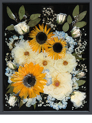 Your bouquet will be dried, pressed and creatively arranged on a black background to make all your colors pop. Depending on the variety, some will be pressed flat and others will be 3D. This gives a lovely floral sculpture look to your Frame. Your flowers are protected with Resin to ensure that the texture, form and colors are retained.